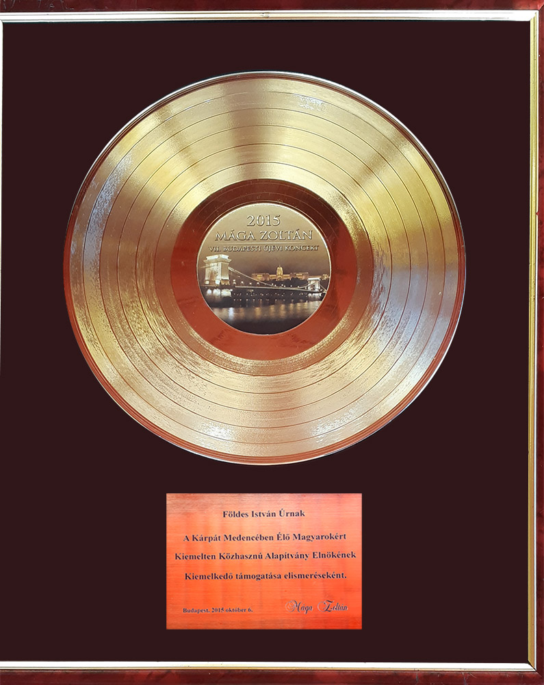Elismerés Földes Istvánnak az összmagyarságnak végzett áldozatos munkájáért Rácz Pál aranykoszorús hegedűkészítő mestertől és Mága Zoltán hegedűművésztől