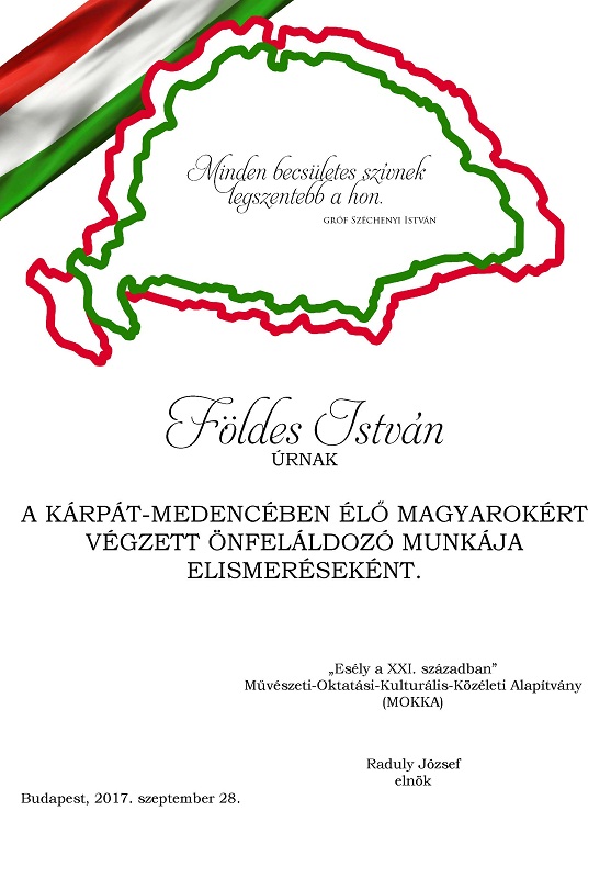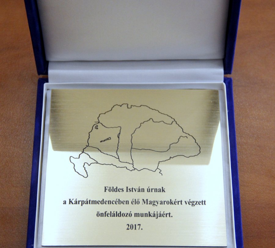 Földes Istvánnak - A Kárpát-medendében élő magyarokért végzett önfeláldozó munkája elismeréseként