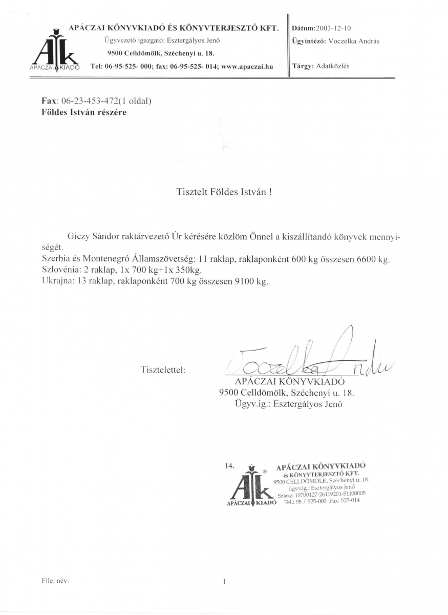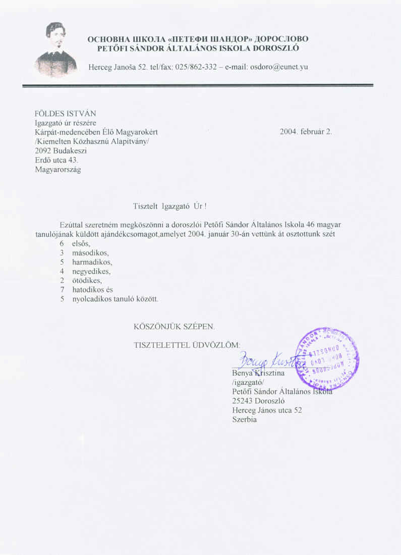 Köszönőlevél a doroszlói Petőfi Sándor Általános Iskola igazgatónőjétől