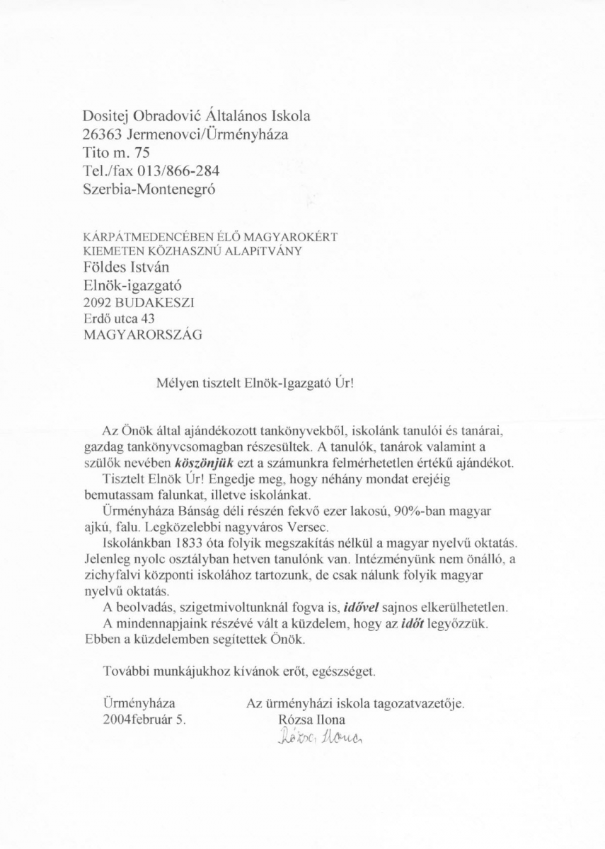 Köszönőlevél az Ürményházai iskola tagozatvezetőjétől