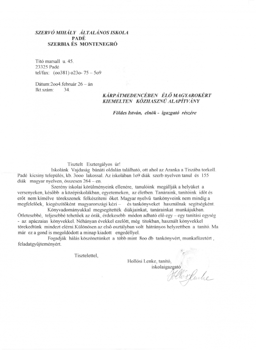 Köszönőlevél a pádéi általános iskola igazgatónőjétől