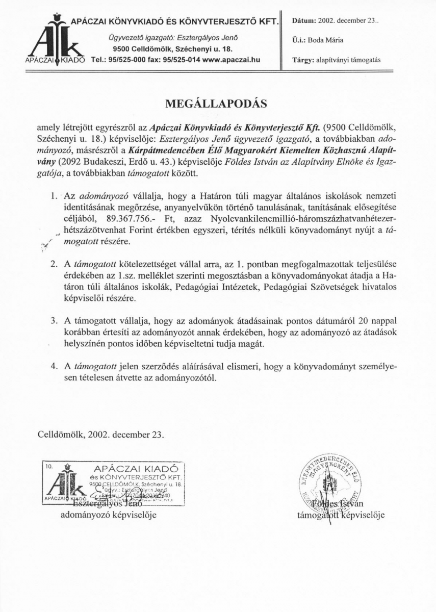 Megállapodás az Apáczai kiadóval, tankönyvtámogatásról.