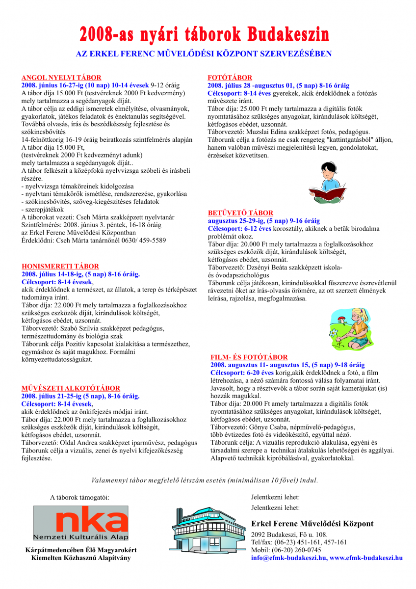Az Erkel Ferenc Művelődési Központ által szervezett nyári gyerektáborok támogatása