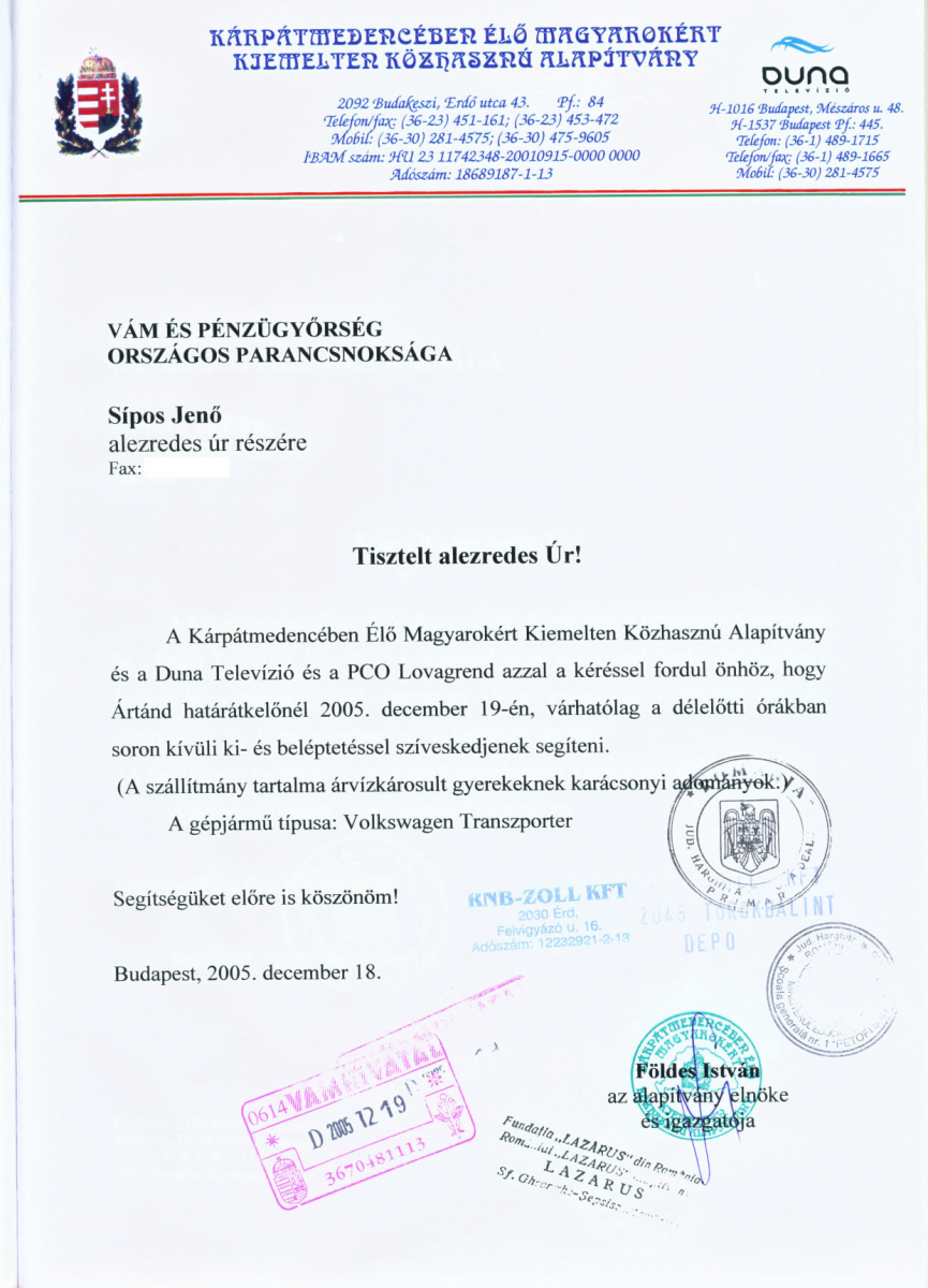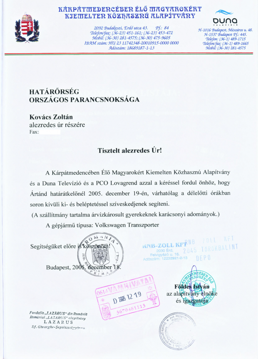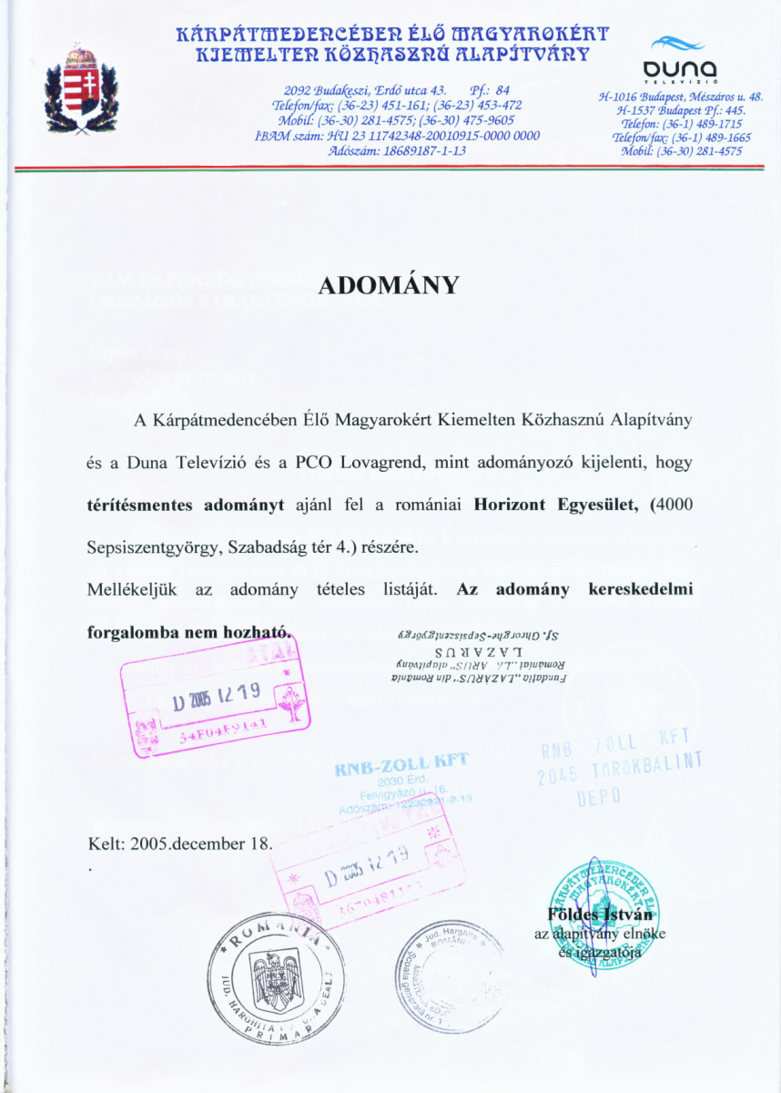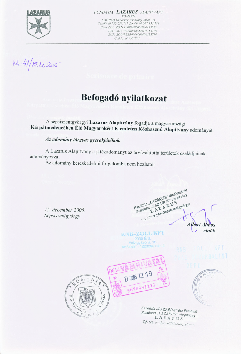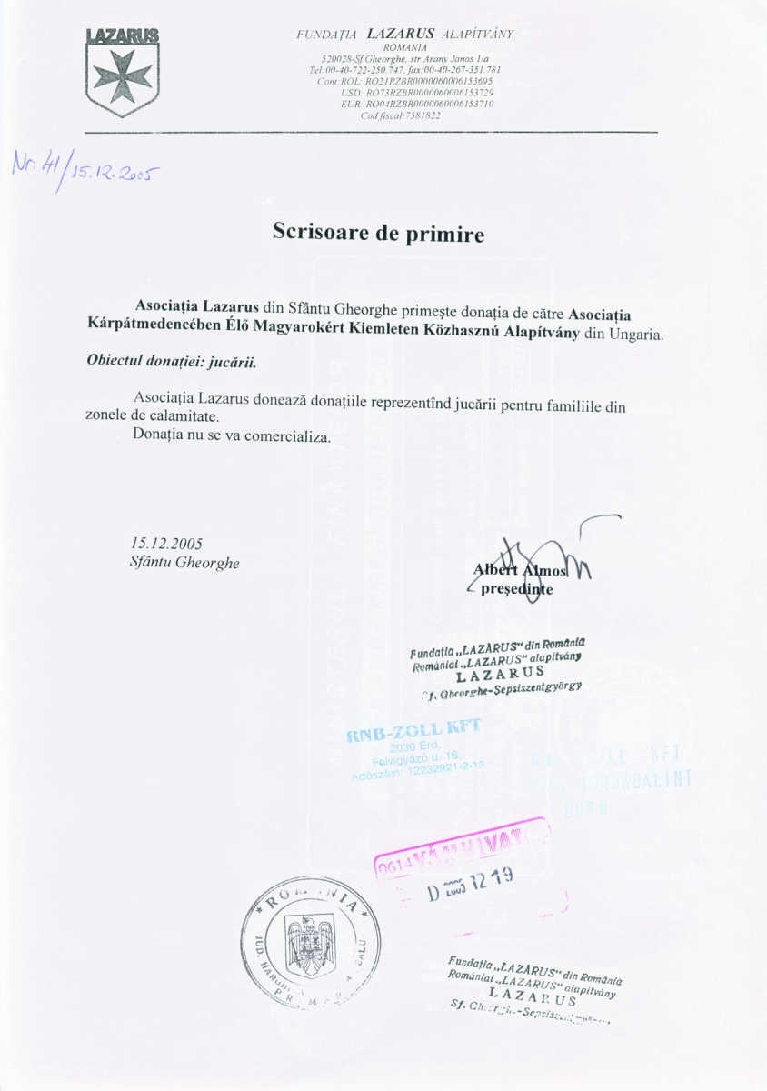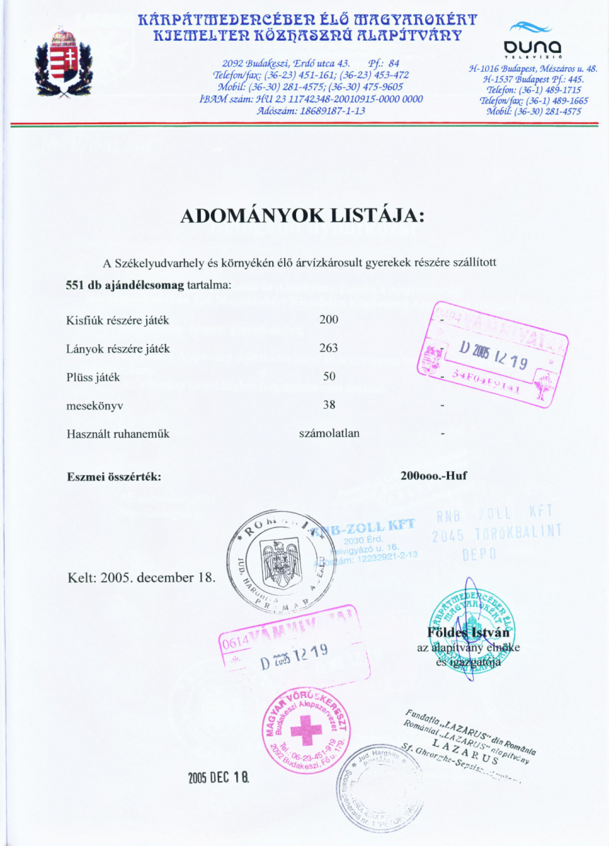 Alapítványunk, a DUNA Televízió és a PCO Lovagrend karácsonyi ajándékcsomagokat juttatott el a sepsiszentgyörgyi székhelyű Romániai LAZARUS alapítványon keresztül a Székelyudvarhely környékén pusztított árvíz károsultjainak gyermekeihez.