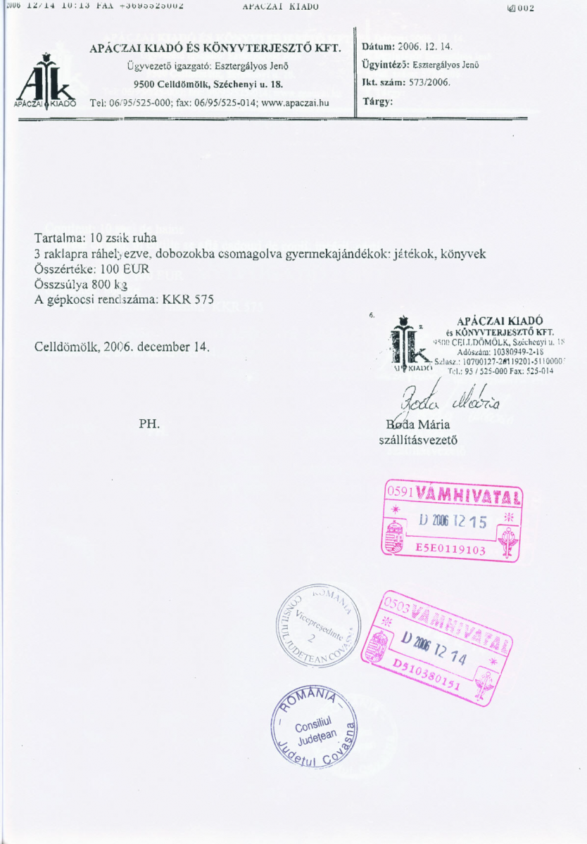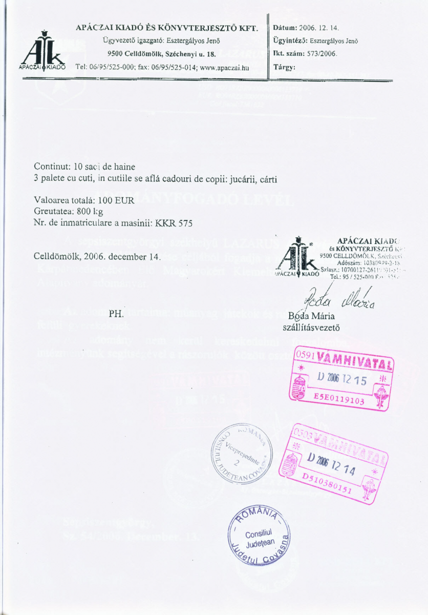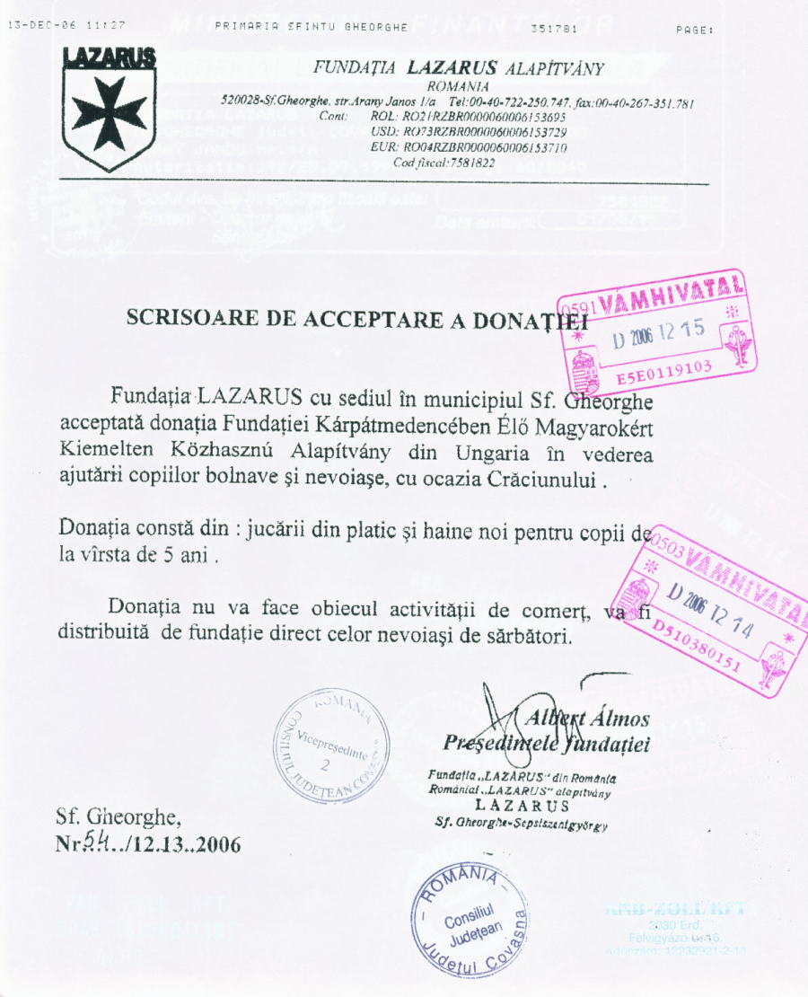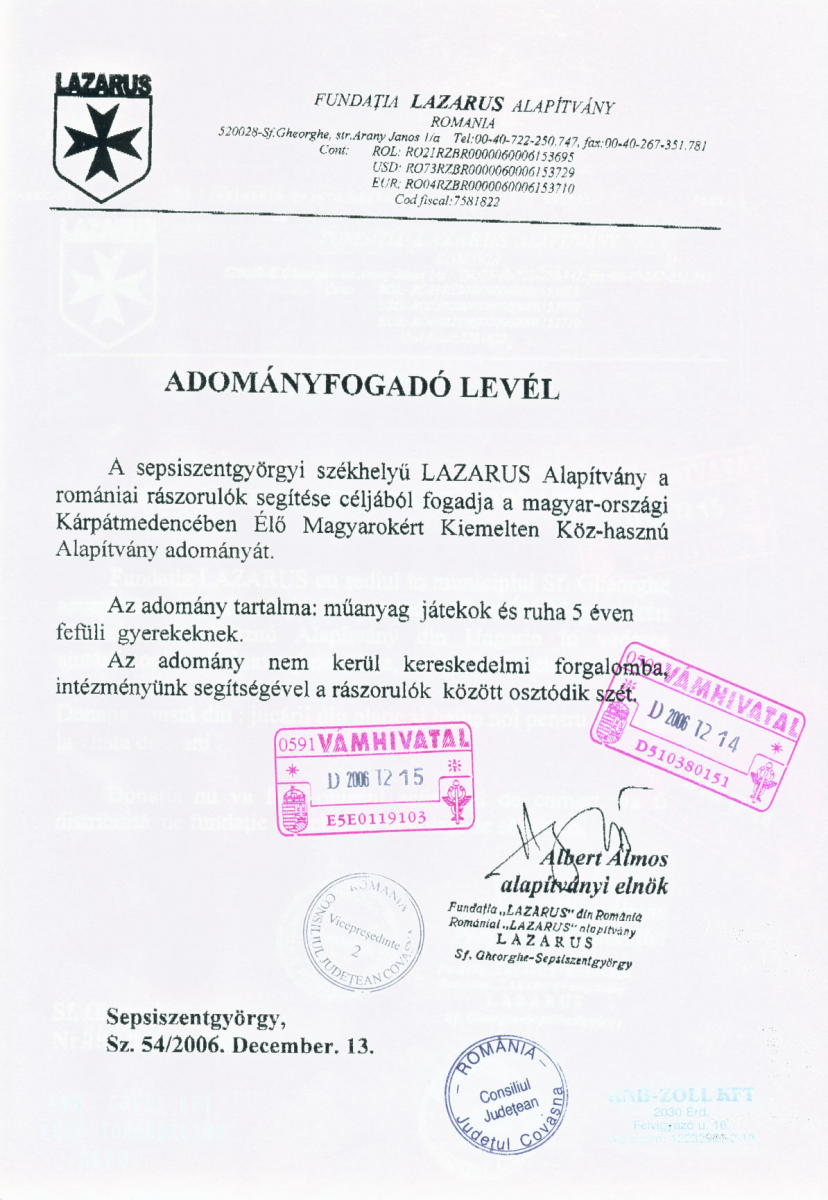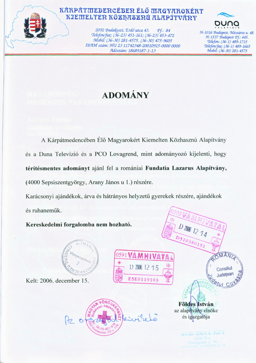 Alapítványunk, a DUNA Televízió, a PCO Lovagrend és az Apáczai Kiadó karácsonyi adományt juttatott el a sepsiszentgyörgyi székhelyű Romániai LAZARUS alapítvány számára.