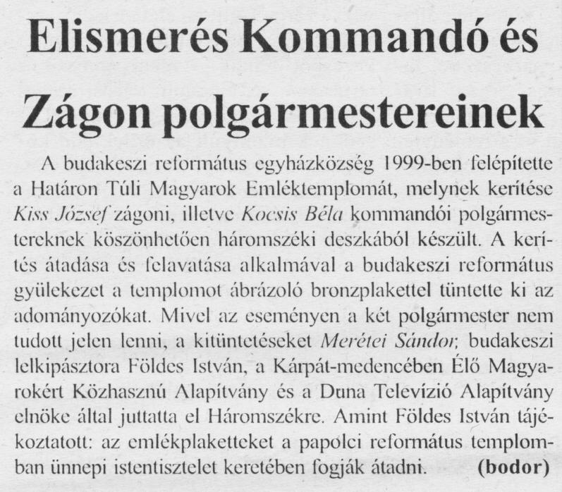 A budakeszi refornátus egyházközség 1999-ben felépítette a Határon Túli Magyarok Emléktemplomát, melynek kerítése Kiss József zágonl, illetve Kocsis Béla kommandói polgármestereknek köszönhetően háromszéki deszkából készült. A kerítés átadása és felavatása alkalmával a budakeszi református gyülekezet a templomot ábrázoló bronzplakettel tüntette ki az adományozókat. Mivel az eseményen a két polgármester nem tudott jelen lenni, a kitüntetéseket Merétei Sándor, budakeszi lelkipásztora Földes István, a Kárpát-medencében Elő Magyarokért Közhasznú Alapítvány és a Duna Televízió Alapítvány einöke által juttatta el Háromszékre. Amint Földes István tájékoztatott: az emiékplaketteket a papolci refonmátus templomban ünnepi istentisztelet keretében fogják átadni.