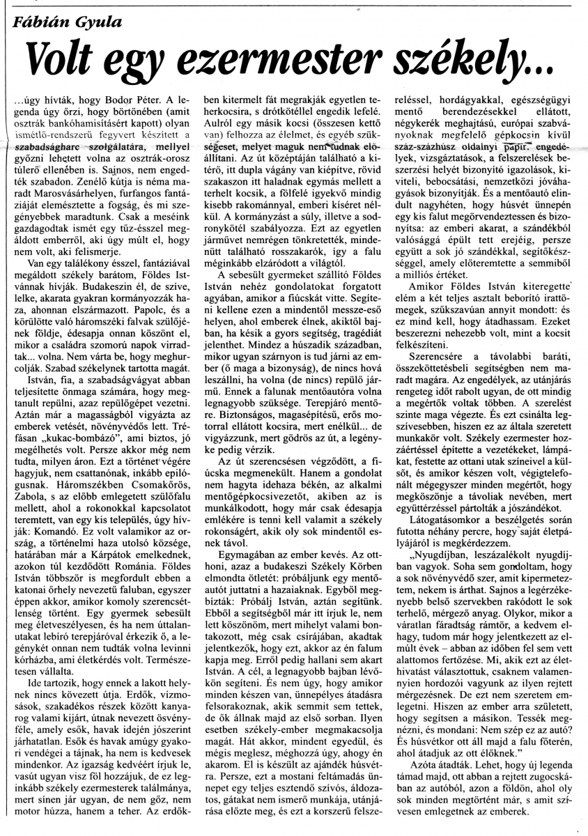 Az „Új Idők” c. lapban, a Komandónak adományozott mentőautóról és Földes Istvánról megjelent cikk.