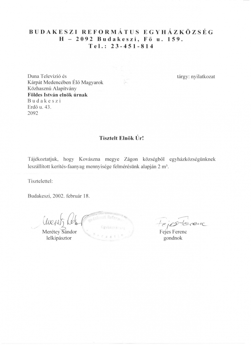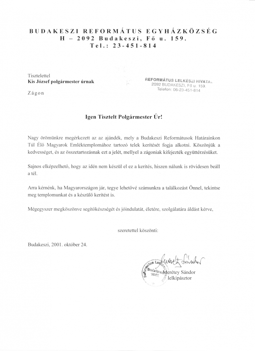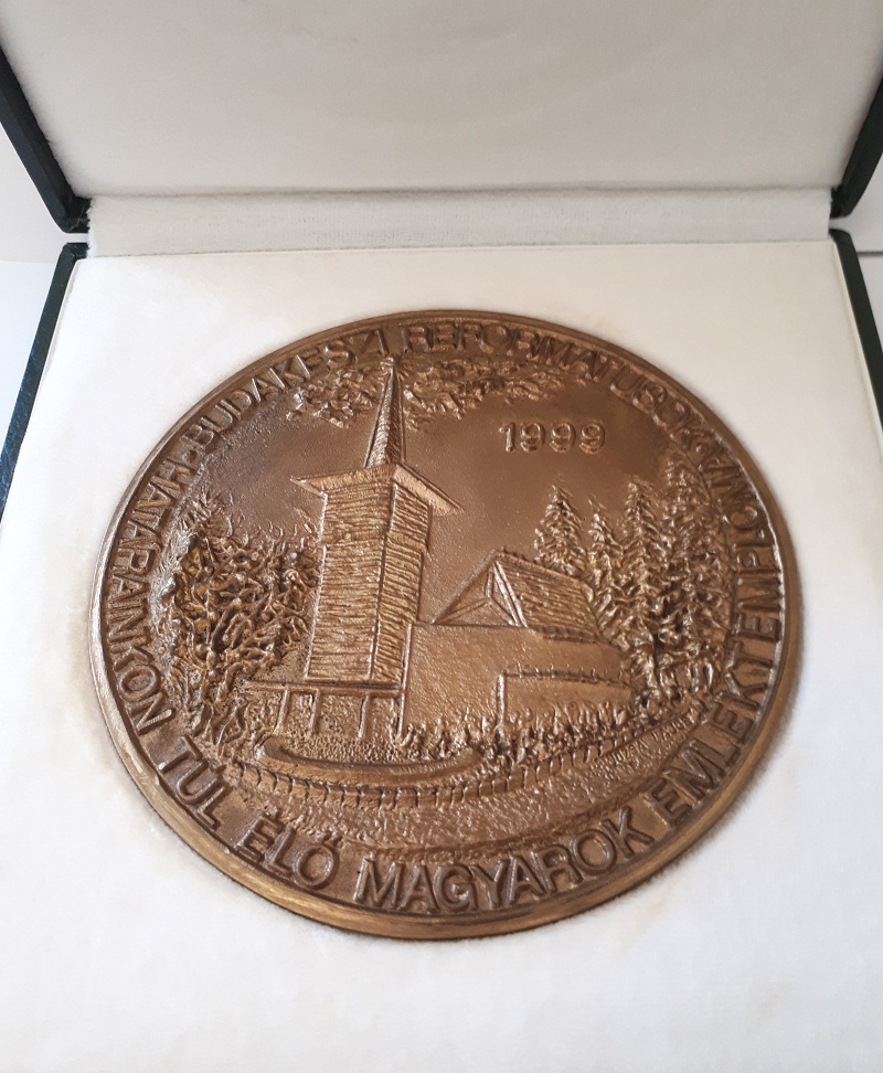 Földes Istvánnak a Budakeszi Református Határainkon Túl Élő Magyarok Emléktemploma támogatásáért emlékérmet adott át Merétei Sándor lelkész