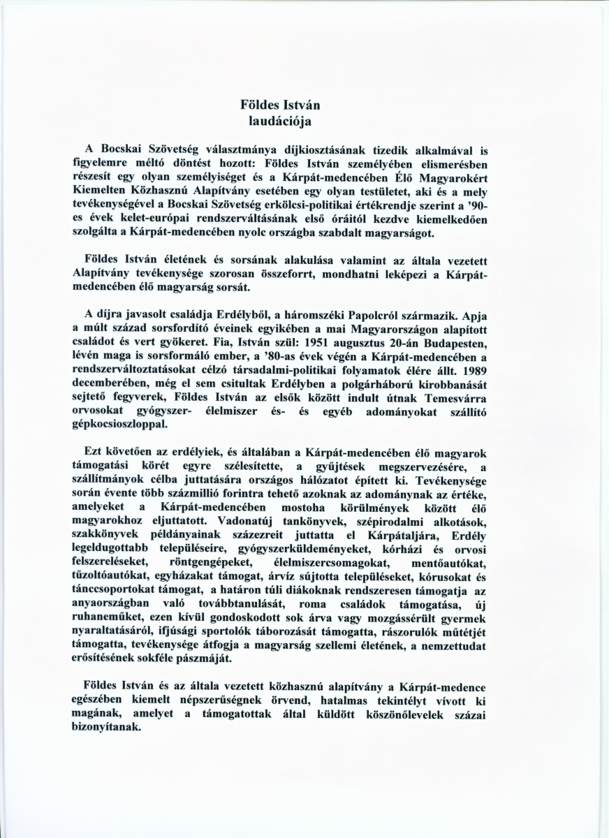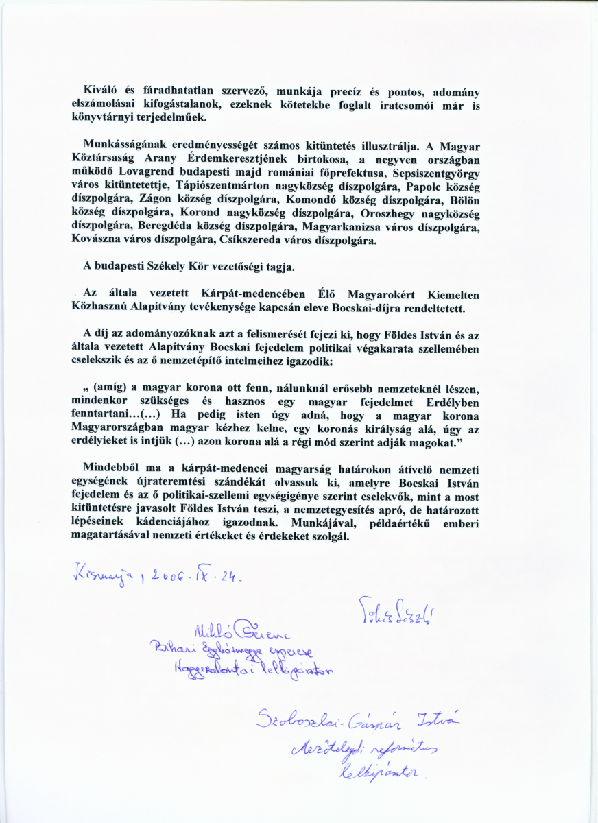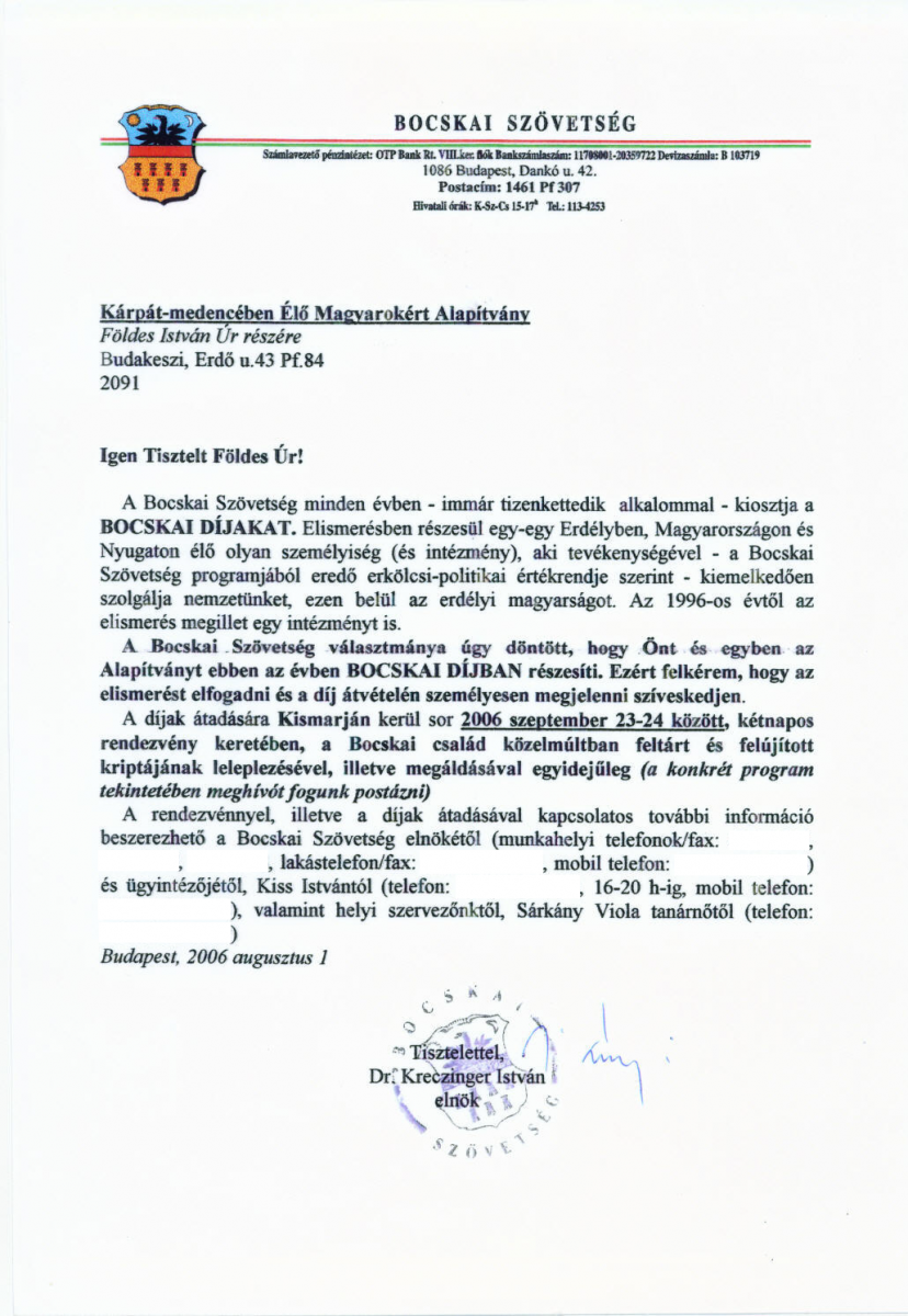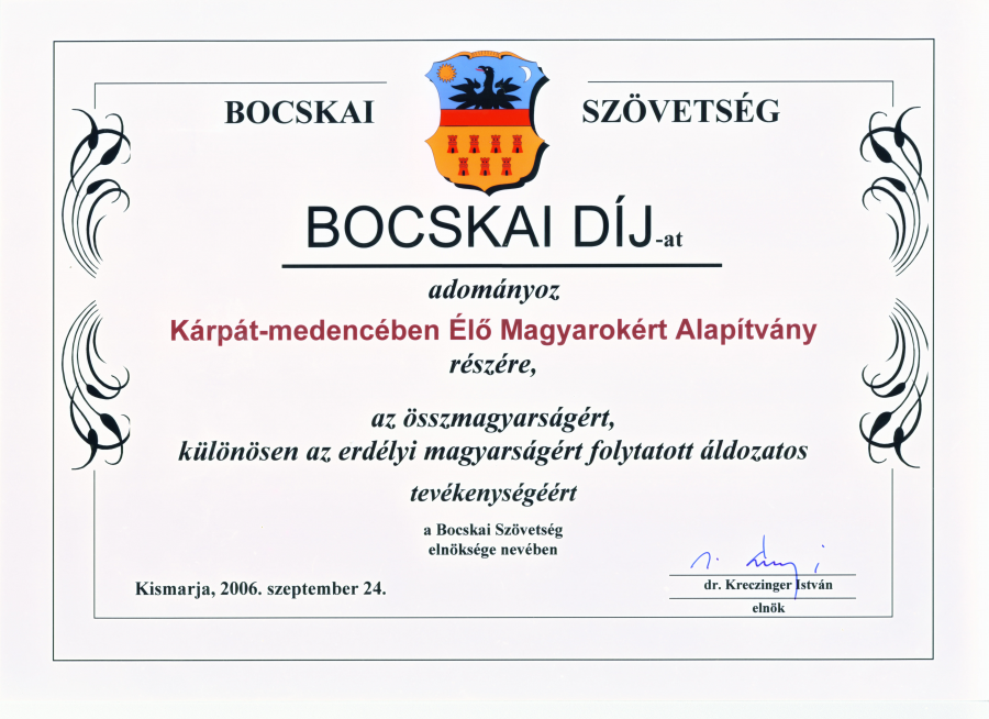 Alapítványunk és elnöke Földes István 2006. szeptember 24-én vehette át a Bocskai díjat.