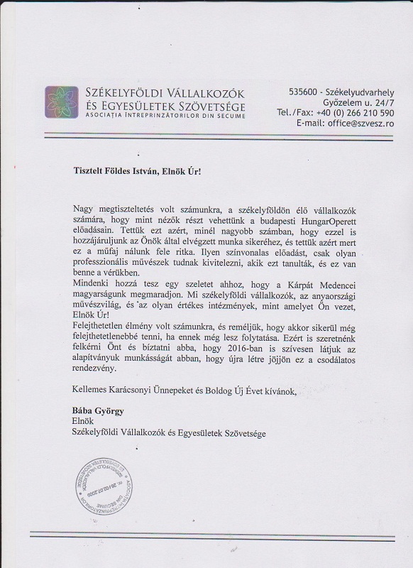 Köszönőlevél - Székelyföldi Vállalkozók
