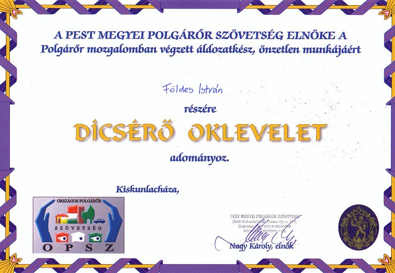 Dícsérő Oklevél - Polgárőr - Kiskunlacháza