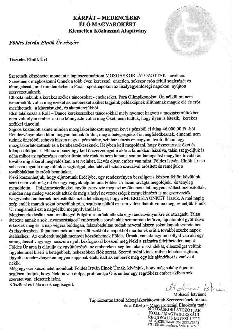 Köszönőlevél - Tápiószentmártoni Mozgáskorlátozottak